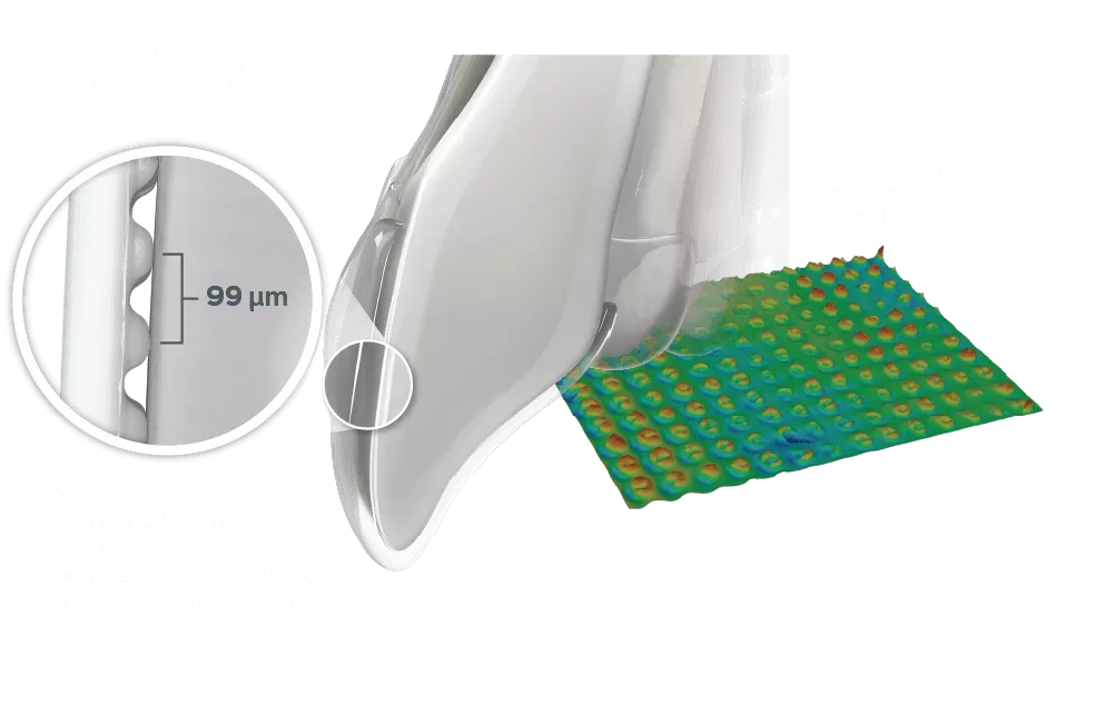 Os alinhadores Spark™ foram desenvolvidos para proporcionar um movimento dentário mais eficiente e eficaz em comparação com a principal marca de alinhadores. Eles oferecem as soluções tecnológicas mais avançadas para uma ampla variedade de maloclusões, incluindo espaçamento, apinhamento, mordida aberta, mordida cruzada, prognatismo e sobremordida. Com os alinhadores Spark, mais transparentes e confortáveis, você conta com diversas soluções para alinhar os dentes e ajudar seus pacientes a alcançarem seus objetivos de sorriso.